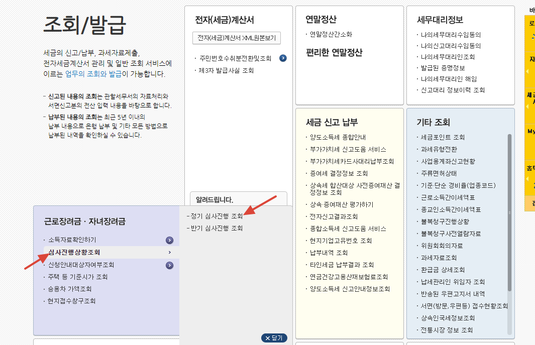 pc로는 국세청 홈택스로 모바일로는 국세청 손택스 앱을 통해 확인해볼 수 있습니다. 일단 공인인증서 등으로 로그인을 한 뒤에 조회/발급으로 들어갑니다. 그 다음 근로장려금*자녀장려금에서 심사진행상황조회 > 정기 심사진행 조회 순서로 들어가봅니다.