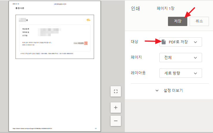 요즘에는 인터넷으로 서류를 제출하는 경우가 아주 많기 때문에 PDF로 저장한 뒤 변환하여 올리시면 됩니다. 아까 인쇄 미리보기 페이지에서 대상을 PDF로 저장을 선택하신 뒤에 저장을 눌러주시면 통장사본 PDF파일이 저장이 됩니다.