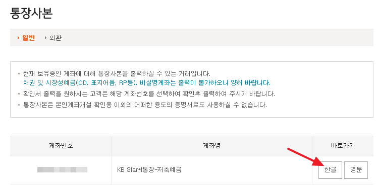 그러면 현재 개설되어있는 계좌번호 목록이 뜨는데 통장사본 출력을 원하는 계좌를 선택해 바로가기 한글을 누르시면 됩니다. 일반계좌와 외환계좌 다 같은 방법입니다.