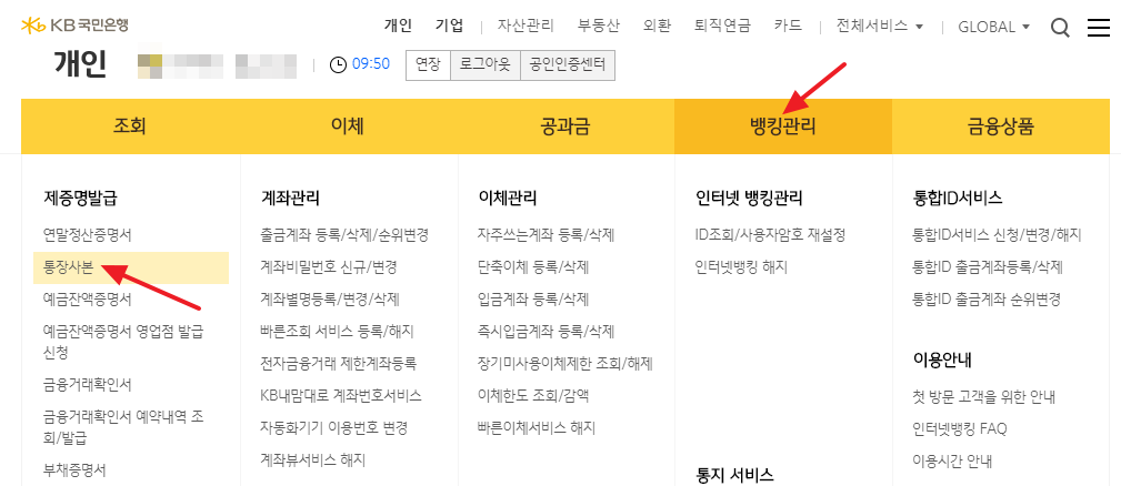 우선 국민은행 인터넷뱅킹 홈페이지로 들어가서 로그인을 해줍니다. 그 다음 메뉴에서 뱅킹관리 > 재증명발급 > 통장사본 순으로 들어가시면 됩니다.