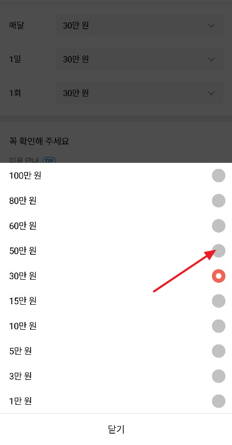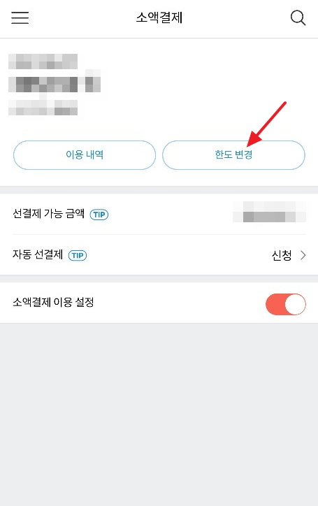 그러면 현재 한도와 남은 한도 등이 표시가 되는데 한도를 올리려면 한도 변경을 누르면 됩니다. 1만원에서 100만원까지 설정을 할 수 있는데 한도상향의 경우는 현재 한도의 윗단계로만 할 수 있습니다. 그러니까 현재 30만원이라고 한번에 100만원으로 설정할 수는 없다는 것이죠. 매월 한단계씩 올라갈 수 있습니다. 하지만....
