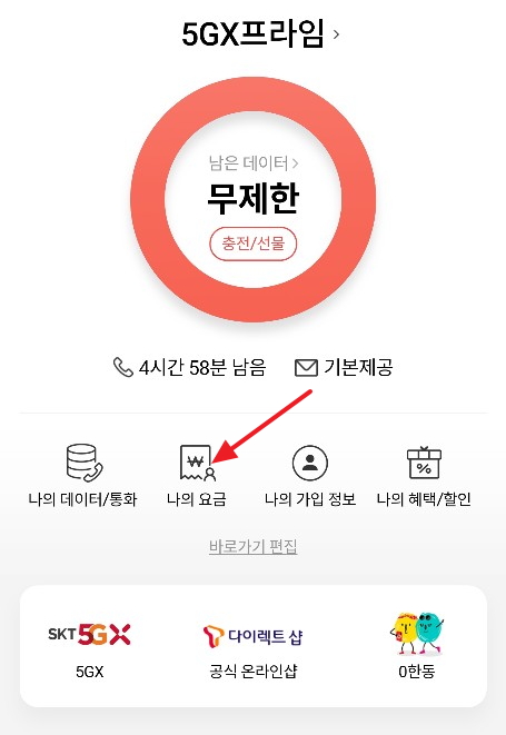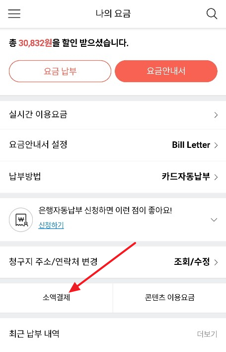 티월드에 로그인하시면 메인에 나의요금이 있습니다. 이걸 터치해서 넘어가신 뒤 중간쯤에 보이는 소액결제를 누릅니다.