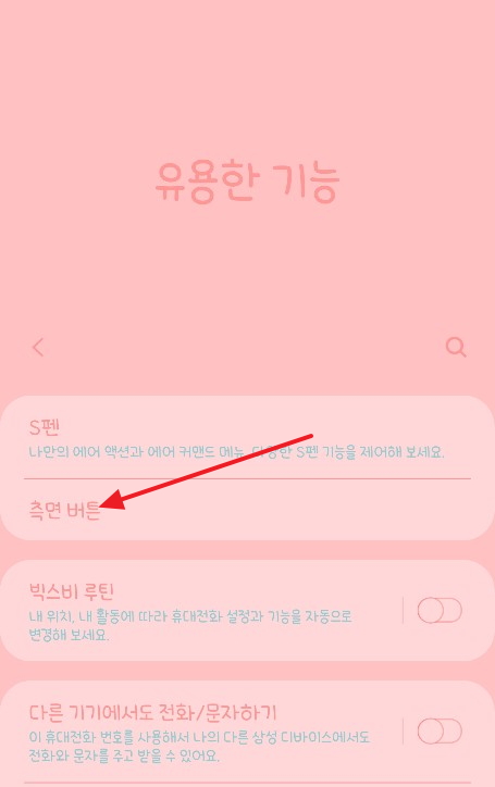 핸드폰 설정에 가셔서 중간쯤에 유용한 기능으로 들어갑니다. 그 다음 측면 버튼을 누르시면 됩니다. 이곳에서 다양한 설정을 할 수가 있는데요. 볼륨버튼 아래에 있는 버튼을 길게 누르거나 두번 눌렀을 때 실행되는 행동을 설정할 수가 있습니다.