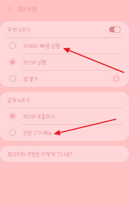 전원을 끄려고 길게 눌렀을 때 빅스비가 호출되는 경우가 많은데 여기에서 전원 끄기 메뉴로 변경하시면 전원버튼으로 바뀝니다. 또한 두번 눌렀을 때 카메라 실행이나 다른 앱 열기로 설정하시면 빅스비 버튼 끄기를 할 수 있습니다. 노트10 이전에는 빅스비버튼이 따로 있어서 설정방법이 조금 다를 수는 있지만 휴대폰 설정에 가시면 끄는 메뉴가 있으니 찾아보시면 될것 같습니다.