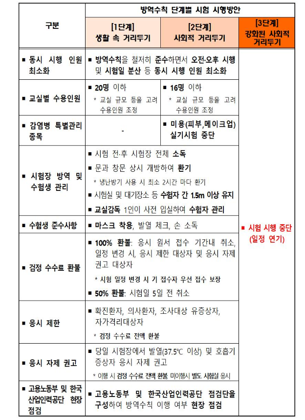 사회적 거리두기 1단계에서는 20명이하 인원으로 시험을 보고있습니다. 마스크 착용을 의무화하고 소독 및 환기 그리고 수험자간 거리를 1.5m 이상 유지하며 시험을 실시하고 있습니다. 현재 2단계에서는 시험 인원을 20명에서 16명으로 줄이고 나머지 방역지침은 똑같습니다. 그리고 피부, 메이크업 등 미용부분 실기시험은 중단됩니다. 3단계로 갈 경우 시험이 아예 중단되며 일정 또한 연기됩니다.
