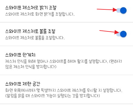 화면 왼쪽 스와이프시 밝기 조절이 가능합니다.
