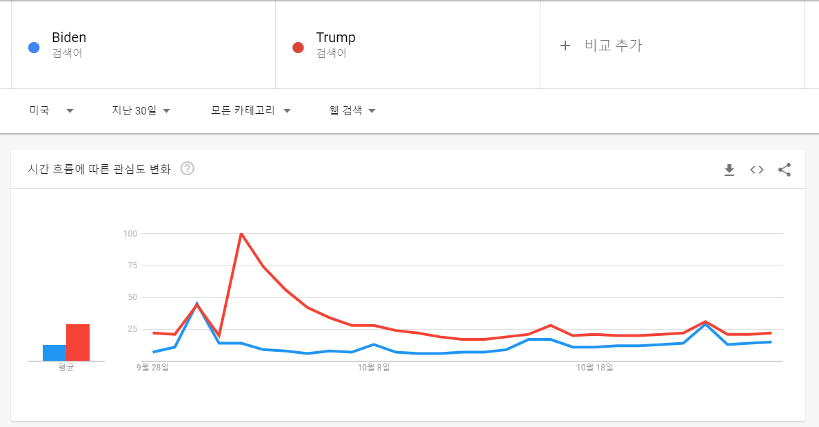 구글트렌드 한달 검색어 추이입니다. 검색으로 본 관심도는 트럼프가 월등히 높네요. 아무튼 초반에는 바이든 지지율이 월등하게 높았으나 점점 격차를 좁혀나가고 있습니다. 미국언론들은 트럼프를 싫어하는 것 같은(?)느낌이 드는데 아무튼 여러 외신들은 바이든이 승리할 것이라 보고있네요. 미국 대선일이 얼마남지 않았으니 관심있게 지켜봐야할 것 같습니다.