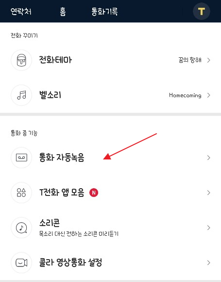 통화 자동녹음 설정은 간단합니다. T전화에서 설정으로 들어갑니다.