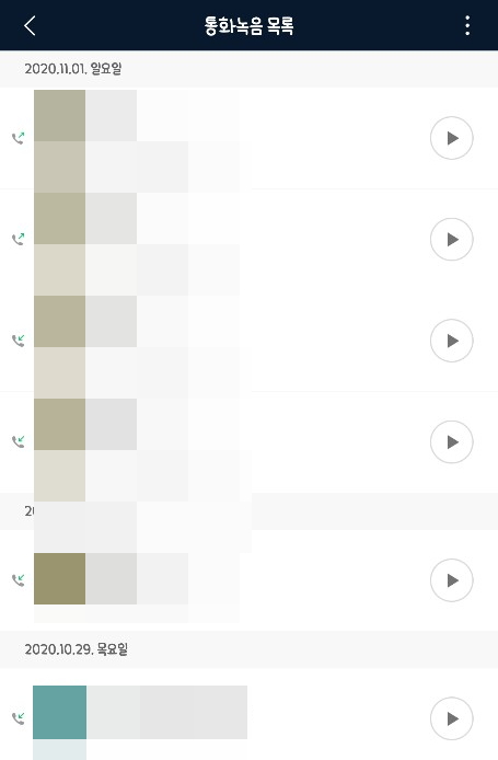 목록에 보시면 통화녹음 목록이 다 보입니다. 하나씩 들어 볼 수 있습니다. 중요한 일이나 갑작스러운 상황 등에 자동녹음을 쓰면 다양하게 활용할 수 있습니다. 제 경우 중요한 일정의 경우 메모를 하지 않아도 통화녹음 된걸 들으면서 다시금 일정을 정리하고 있습니다.