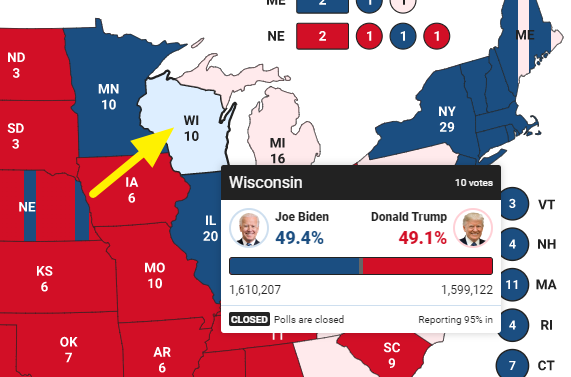 6시 전까지만 하더라도 트럼프가 앞서 가던 곳입니다. 경합주 중에 하나로 10명의 선거인단을 가져갈 수 있는 곳이죠. 경합주들 대부분 트럼프가 우세한 상황이었는데 위스콘신주가 역전하게 되면서 트럼프 입장에서는 모든 경합주를 지켜야하는 상황이 되었습니다.