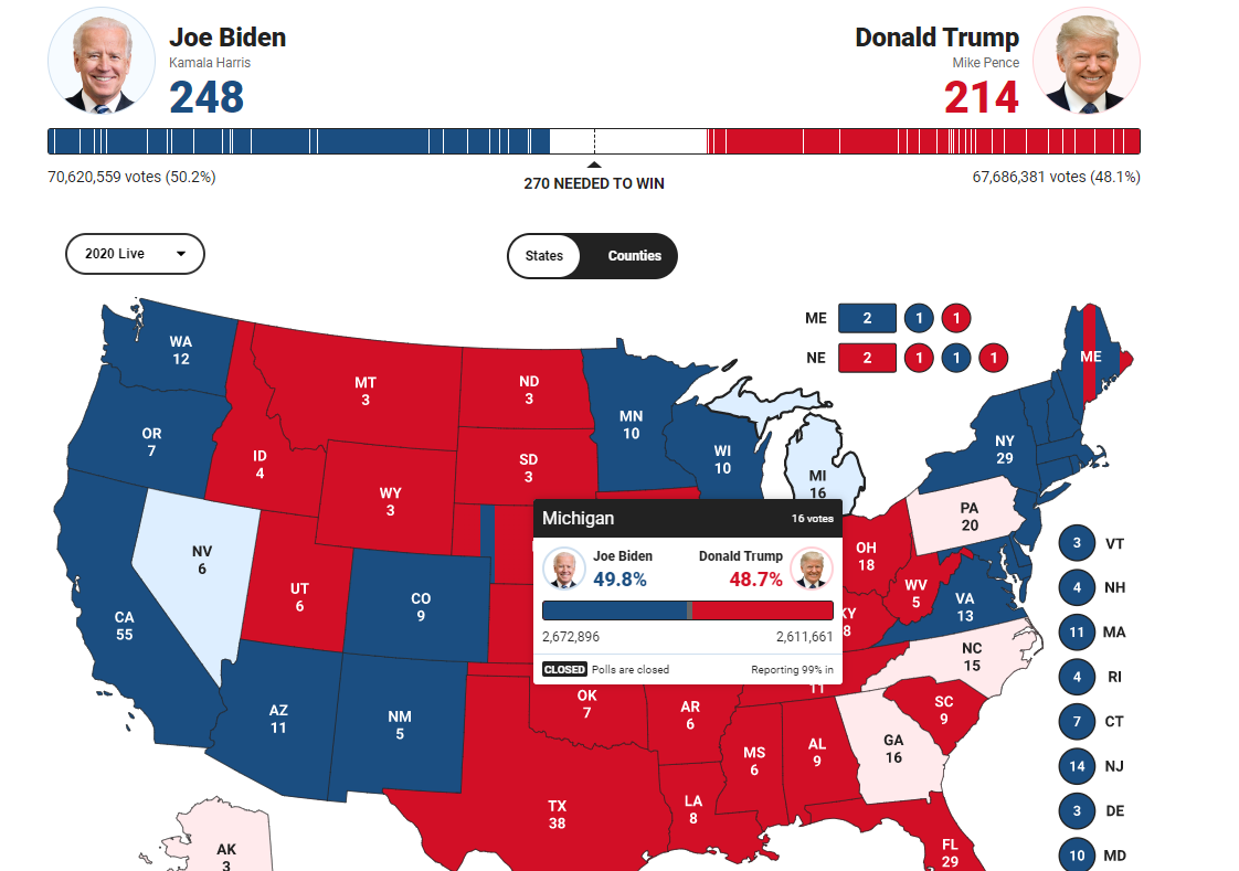 지금 개표 결과를 보면 바이든이 아주 유력한 상태입니다. 역전당했던 위스콘신주는 이미 바이든 확정이되었고 미시간주 역시도 개표율이 99%라 바이든 확정이라고 볼 수 있죠. 이렇게 되면 바이든이 우세한 네바다주를 합치면 270명을 채워 바이든이 당선됩니다.