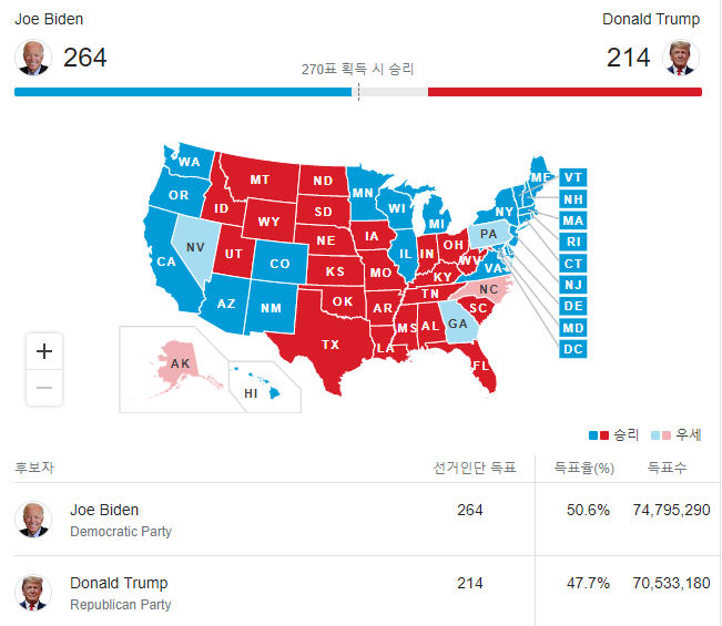 바이든은 모든 개표가 끝날때까지 승리 선언을 하지 않겠다고 했습니다. 현재 네바다주와 알래스카주 등 아직 개표가 완료되지 않은 곳이 있어 이곳들이 끝날때까지는 기다려야될 것 같습니다. 아무튼 바이든이 당선이 확실한데 우리나라 정세에 어떤 영향을 주게될까요.