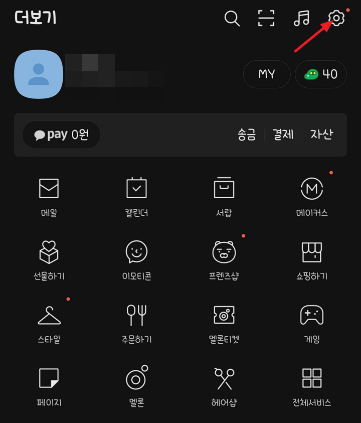 우선 모바일 카카오톡으로 들어가서 마지막 페이지로 넘긴 뒤 톱니바퀴를 눌러줍니다. 더보기 페이지라고 할 수 있겠네요.