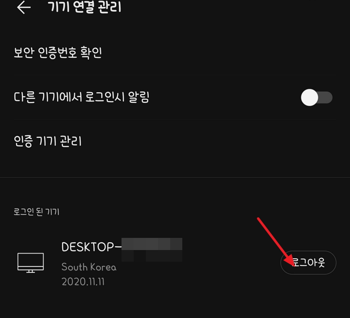 여기에 현재 연결되어 있는 기기가 표시되있는데요. 제 경우 데스크톱 즉 pc에 로그인이 되있는 상태입니다. 여기에서 로그아웃을 누르면 pc에 로그인되있는 카톡이 자동으로 로그아웃됩니다.