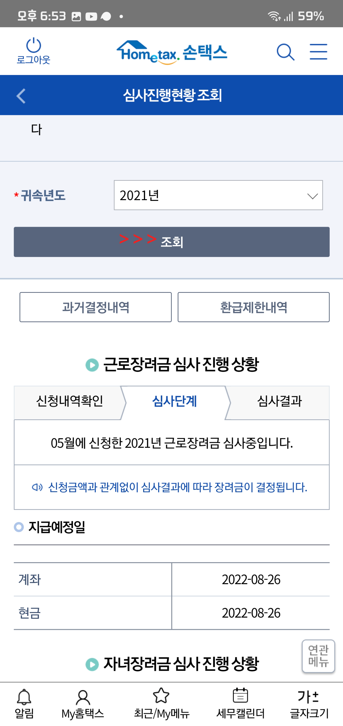지역 세무소마다 조금씩 차이는 있을 수 있지만 2022 근로장려금은 8월 말에 지급이됩니다. 손텍스나 홈텍스에서 확인을 해보면 아직 심사중이라고 뜨지만 지급되는 날짜를 확인해보면 8월 26일에 지급이 된다고 적혀있죠. 작년에 언제쯤 지급되었나 확인해보니 작년에도 8월 26일에 딱 통장에 들어왔더라고요. 예정날짜라 차이는 있을 수 있지만 26일에 지급된다고 생각하시면 될것 같습니다.