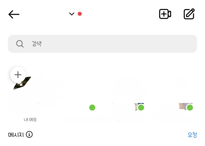 그러면 현재 인스타그램에 접속중인 서로 팔로우가 되어있는 친구들의 현재활동상태가 뜹니다. 위 사진처럼 초록색으로 표시가 되는데 친구들한테도 제 현활상태가 저렇게 보이겠죠?